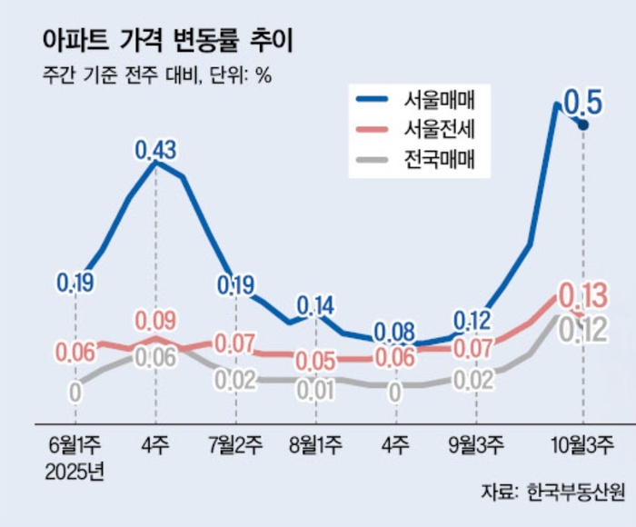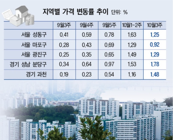 23일 한국부동산원이 발표한 10월 셋째 주(10월20일 기준) 전국 주간 아파트 가격 동향 조사 결과를 보면, 서울 아파트 매매가격은 0.50% 올랐다. 이번 조사는 정부가 10ㆍ15 대책을 통해 서울 전역과 경기도 12개 지역을 20일부터 토지거래허가구역으로 지정하겠다고 밝힌 직후의 시장 심리를 반영한 것으로 주목된다.