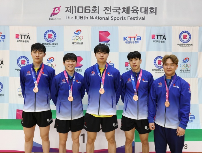| 보람할렐루야탁구단이 부산 기장체육관에서 진행된 제106회 전국체전 탁구 남자 일반부 단체전에서 동메달을 수상했다./사진: 보람그룹 제공 |