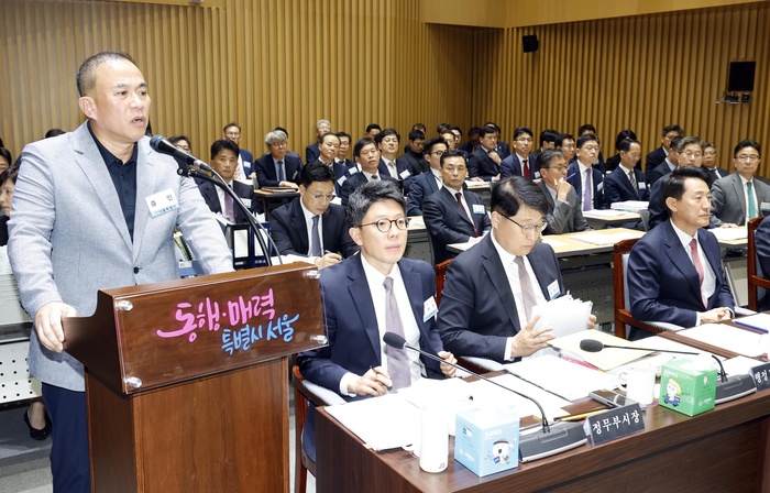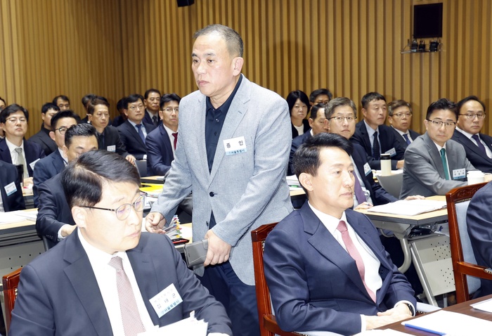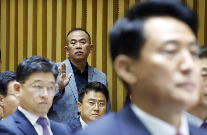 정치 브로커 명태균 씨가 23일 서울시청에서 열린 국회 행정안전위원회의 서울특별시에 대한 국정감사에 증인으로 출석해 의원 질의에 답하고 있다. 오른쪽은 오세훈 서울시장.