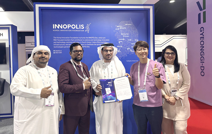 | ㈜라파비가 두바이 현지 벤처캐피털(VC)과 투자유치 및 해외 판로 확대를 위한 업무협약을 체결하고 기념촬영을 하고 있다. / 사진 : 인제대학교 제공 |