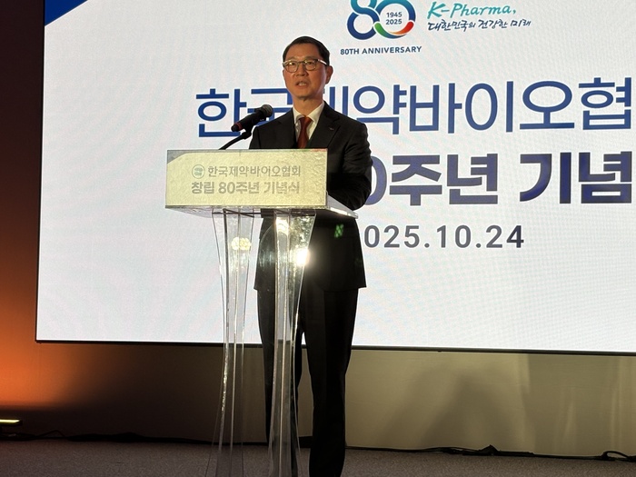 | 24일 한국제약바이오협회 80주년 기념식에서 윤웅섭 한국제약바이오협회 이사장(일동제약 대표)이 환영사를 하고 있다. / 사진: 김호윤 기자. |