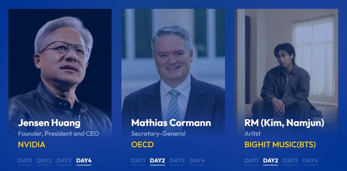 | (왼쪽부터) 젠슨 황 엔비디아 CEO, 마티아스 코먼 OECD 사무총장, 그룹 방탄소년단(BTS) RM. /사진:APEC CEO 서밋 홈페이지 |