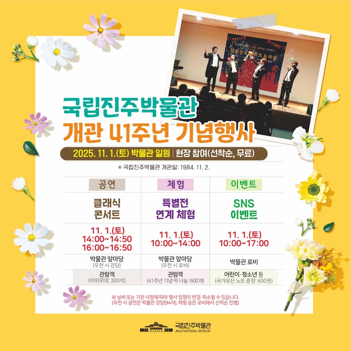 국립진주박물관(관장 장용준)은 개관 41주년을 맞아 오는 11월 1일 박물관 일원에서 기념행사를 개최한다고 29일 전했다