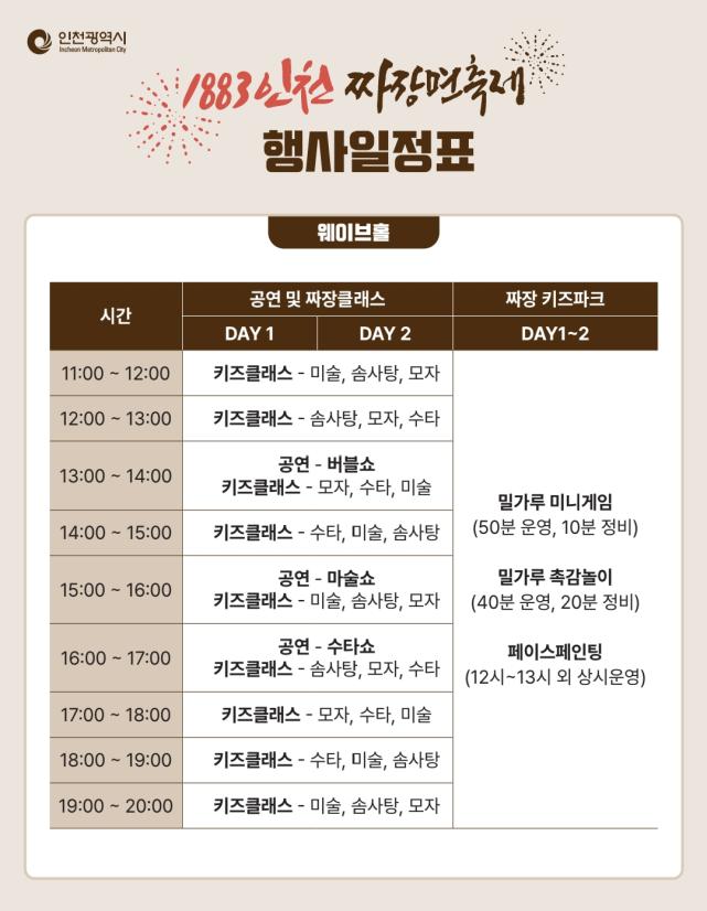 이외에도 어린이를 위한 키즈 클래스와 공연, DIY 짜장면 만들기 체험, 수타면 체험, 짜장면 독서존, 스탬프 투어, 거리 이벤트, 시식·시음 행사 등 남녀노소 누구나 즐길 수 있는 다채로운 프로그램이 준비되어 있다.