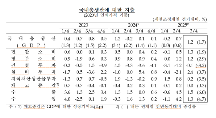 지출 항목별로 보면 민간소비가 승용차·통신기기 등 재화와 음식점·의료 등 서비스 소비가 모두 늘며 1.3% 증가했다. 정부소비도 물건비와 건강보험급여비 확대 영향으로 1.2% 늘었다. 민간소비는 2022년 3분기(1.3%) 이후 3년 만에, 정부소비는 2022년 4분기(2.3%) 이후 2년 9개월 만에 각각 가장 높은 증가율이다.
