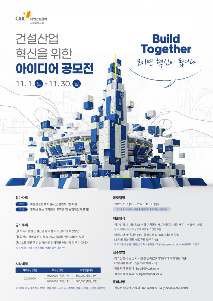 이번 공모전은 건설업체 임ㆍ직원, 대학생 등 누구나 참여할 수 있다. 공모 주제는 △지속가능한 건설산업을 위한 미래전략 및 혁신방안 △회원사 경영애로 지원 및 가치증대를 위한 서비스 모델 △A.I.를 활용한 건설경영 및 현장적용 방안 등이다.