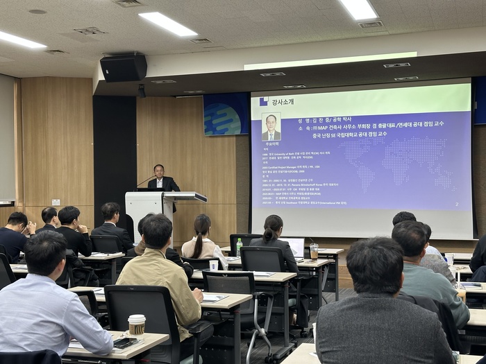 | 해외건설 글로벌 트렌드와 대응전략특별강좌에서 MAP건축사사무소 김찬중 부회장이 강의를 하고 있다. / 사진: 해건협 제공. |