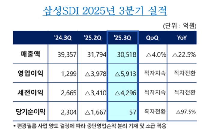 삼성SDI는 3분기 영업손실 5913억원을 기록하며 적자 전환했다고 28일 밝혔다. 이는 증권가 컨센서스(손실 3000억원대)보다 부진한 수준이다. 작년 4분기 이후 4개 분기 연속 적자를 이어갔다. 매출은 3조518억원으로 전년 동기 대비 22.5% 감소했다.