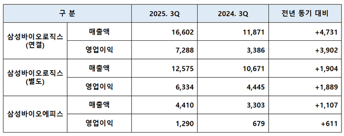 삼성바이오로직스는 28일 공시를 통해 2025년 3분기 연결기준 매출 1조6602억원, 영업이익 7288억원을 기록했다고 밝혔다. 이는 전년 동기 대비 매출액은 39.86%, 영업이익은 115.27% 증가한 수치다.