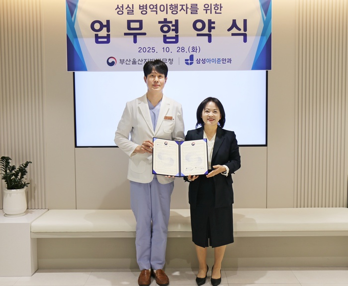 부산울산병무청(청장 한순영)은 28일 삼성아이준안과(부산 연제구 소재)와 병역명문가 등 성실 병역이행자 예우를 위한 협약을 체결했다고 밝혔다.