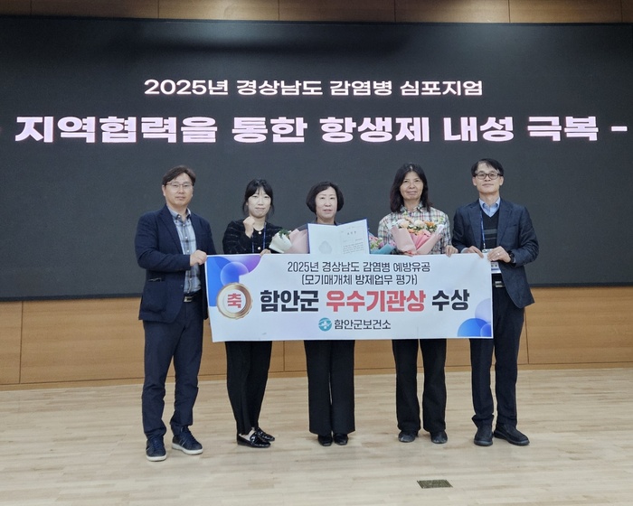 함안군보건소가 경상남도 주관 ‘2025년 감염병 예방 유공(모기매개체 방제업무)’ 평가에서 우수기관으로 선정돼, 28일 창원 진해에서 열린 ‘2025 경상남도 감염병대응 심포지엄’에서 도지사 표창을 수상했다고 밝혔다.