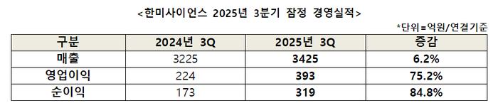 한미사이언스는 올해 3분기 연결기준 잠정 실적으로 영업이익이 75.2% 증가한 393억원을 기록했다고 29일 밝혔다. 같은 기간 매출액은 6.2% 늘어난 3425억원을, 순이익은 84.8% 올랐다.