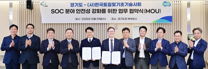 경기도가 29일 경기도 북부청사에서 (사)토질및기초기술사회와 업무협약(MOU)을 체결했다. 이번 협약은 도내 SOC(사회기반시설) 건설에 있어 지반·기초 분야의 안전성을 한층 높이기 위한 것으로 경기도와 학회간 상시 협력 시스템을 마련하고자 추진됐다.