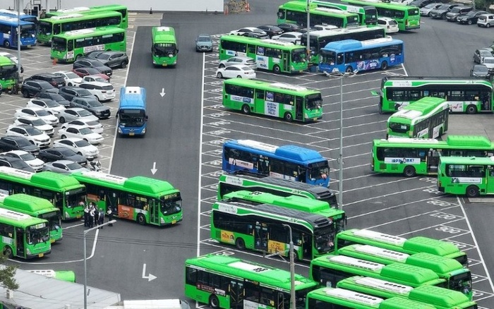 | 지난 5월 서울 시내의 한 공영버스 차고지에 버스들이 세워져 있다. / 사진 : 연합 |