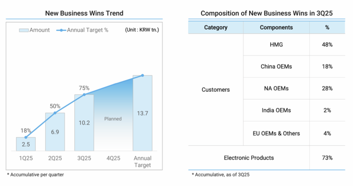 고객사별 수주 비중을 보면 현대차그룹이 48%로 가장 많았고, 북미 완성차 업체가 28%, 중국 업체가 18%를 차지했다. 제품별로는 전자제품이 73%를 차지했다.
