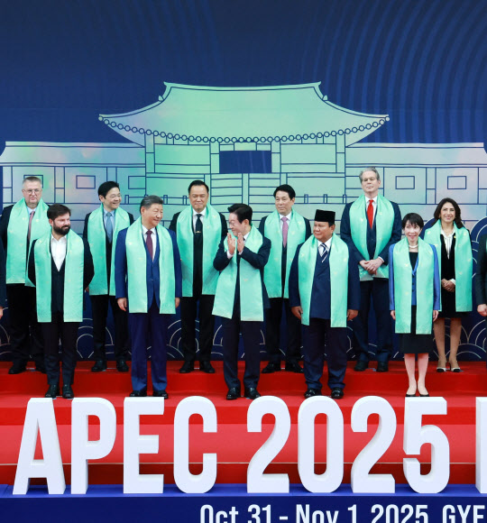 | 이재명 대통령(사진 앞줄 가운데)이 1일 경주화백컨벤션센터(HICO)에서 열린 2025 아시아태평양경제협력체(APEC) 정상회의에서 각국 정상들과 한복 소재로 만든 목도리를 두르고 기념 촬영을 하고 있다./사진:연합뉴스 |