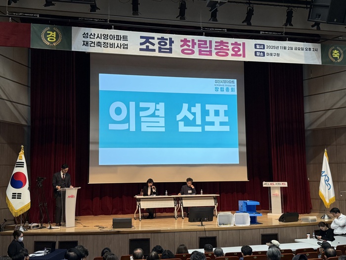 | 2일 서울 마포구 성산동 마포구청에서 열린 ‘성산시영아파트 재건축정비사업 조합 창립총회’ 현장 모습. / 사진=전동훈 기자. |