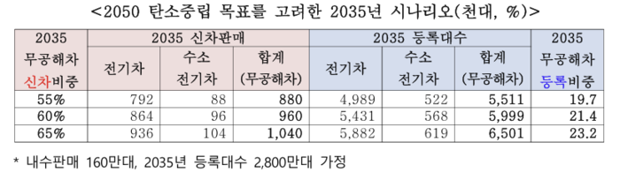 사실상 내연기관차 퇴출 수준의 목표다. 산업계와 노동계는 최근 보급 추이, 보조금 예산, 업계 판매계획 등을 고려할 때 2035년 무공해차 등록대수를 550만∼650만대(등록비중 19.7∼23.2%) 수준으로 설정하는 게 합리적이라는 입장이다. 이 목표는 국내 생산 전기차 중심으로 보급목표 달성이 가능한 수준이며, 감축 부족분은 교통정책 개선ㆍ물류효율화ㆍ친환경 운전문화 확산 등을 통해 충분히 보완할 수 있다고 설명했다.