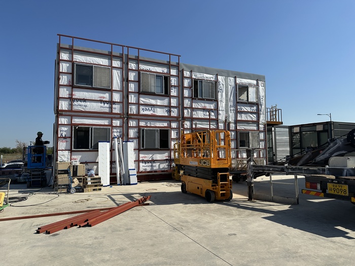 [대한경제=손민기 기자]지난달 28일 충남 당진시 석문국가산단에 위치한 유창이앤씨 석문공장에 들어서자 공동주택 작업 중인 모듈 목업(시험건축물)이 한눈에 들어왔다. 세종 5-1 행복주택에 투입될 2층 목업 유닛이다. 현대엔지니어링ㆍ계룡건설 컨소시엄이 수행하는 이 사업은 국내 최대 규모의 모듈러 공동주택으로, 유창이앤씨는 총 982개 모듈을 제작ㆍ투입한다.