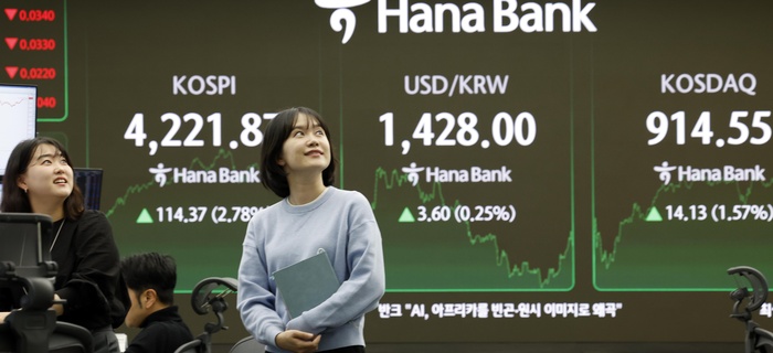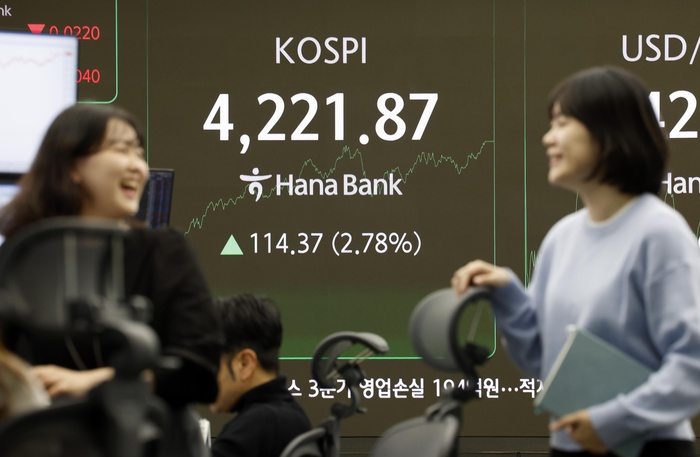 코스피가 반도체주 강세에  힘입어 4,200선을 넘어서며 사상 최고치를 경신한 3일 서울 중구 하나은행 본점 딜링룸 전광판에 종가가 표시되고 있다.