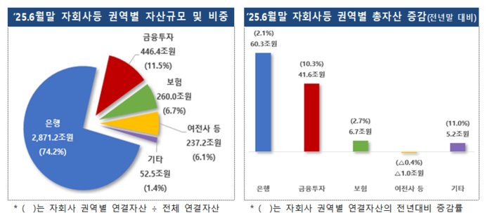 총자산 대비 권역별 자산 비중은 은행이 74.2%(전년 말 74.9% 대비 소폭 감소)로 가장 높고 금융투자 11.5%, 보험 6.7%, 여전사 등 6.1%를 차지했다.