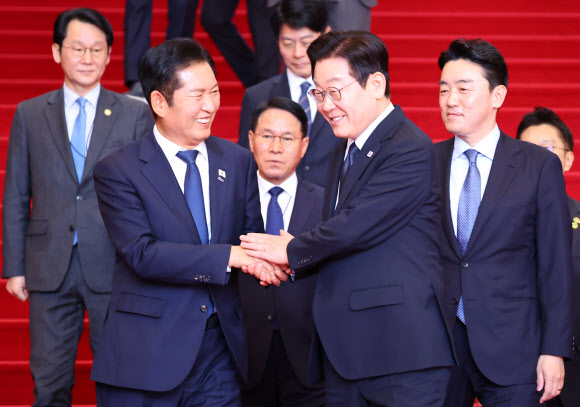 | 이재명 대통령이 4일 2026년도 정부 예산안 시정연설을 마친 뒤 국회를 나서며 더불어민주당 정청래 대표와 인사하고 있다./사진:연합 |