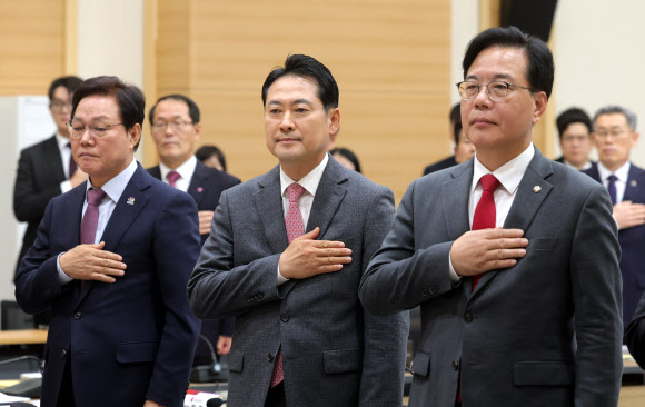 | 4일 경남 창원시 경남도청에서 열린 국민의힘-부산·울산·경남 지역민생 예산정책협의회에서 국민의힘 장동혁 대표(가운데)와 송언석 원내대표 등이 국민의례를 하고 있다./사진:연합 |
