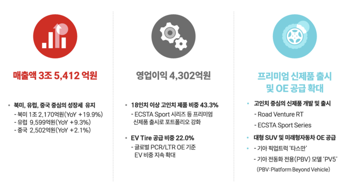 3분기 전기차 타이어 공급 비중은 22.0%로, 2025년 목표인 26%를 눈앞에 뒀다. 글로벌 신차용 타이어(OE) 비중을 지속 확대하고 있으며, 2024년 대비 14개 차종에 EV 전용 타이어를 추가 공급할 예정이다.