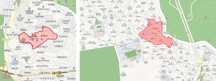 | 이태원동 214-37번지 일대(왼쪽)와 용산동2가 1-597번지 일대(오른쪽) 위치도. / 사진 : 용산구 제공 |