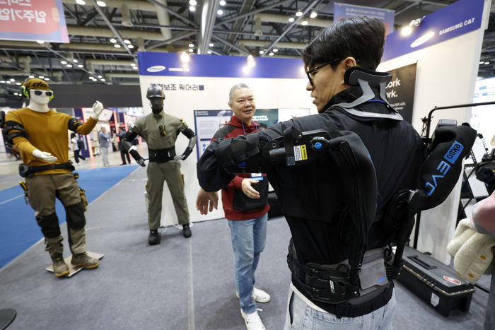 | 2025 스마트 건설·안전·AI 엑스포에서 관람객들이 스마트 건설 안전 웨어러블 제품을 체험하고 있다. |