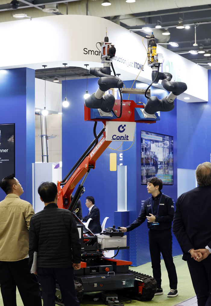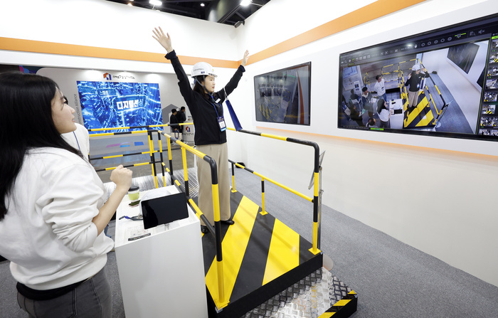 5일 경기 고양시 킨텍스에서 열린 2025 스마트 건설·안전·AI 엑스포에서 관람객들이 CCTV를 활용한 건설현장 및 시설물 관리 통합관제 시스템을 체험하고 있다.