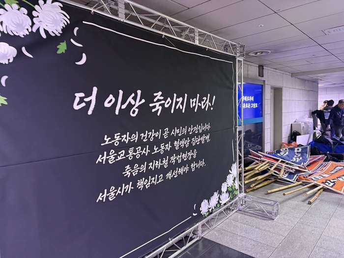 | 지난 4일 서울시청 지하 시민청 인근에서 서울교통공사노조 관계자들이 ‘안전인력 감축 중단’‘부당 임금삭감 저지’ 등이 적힌 현수막을 설치하고 있다. / 사진 : 박호수 기자 |