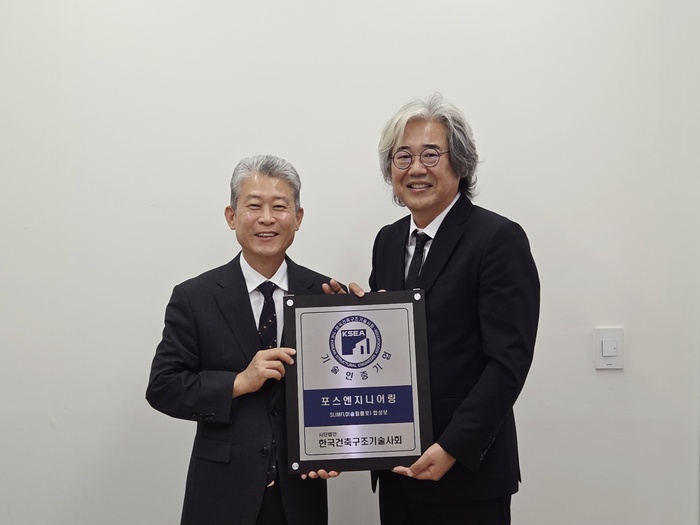 | 김영민 한국건축구조기술사회 회장(왼쪽)과 박대원 포스엔지니어링 대표가 현판식 후 기념촬영을 하고 있다. / 건축구조기술사회 제공 |