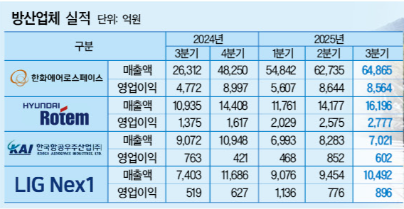앞서 실적을 발표한 한화에어로스페이스는 3분기 연결 매출액 6조4865억원, 영업이익 8564억원으로 전년 동기 대비 각각 147%, 79% 폭증한 것으로 나타났다.