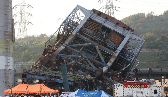 | 6일 오후 2시 2분께 울산 남구 용잠동 한국동서발전 울산발전본부 울산화력발전소에서 60m 높이 보일러 타워가 무너져 2명이 구조되고 7명이 매몰된 것으로 추정된다. 사진은 사고 현장./사진:연합뉴스 |