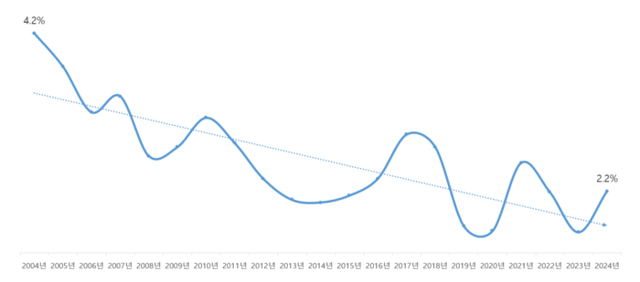대한상공회의소(회장 최태원)가 10일 발간한 ‘K성장 시리즈 매출액 1000대 기업의 20년 수익성 추이와 시사점’ 보고서에 따르면 최근 20년 새 총자산영업이익률이 4.2%에서 2.2%로 크게 떨어진 것으로 분석됐다. 총자산영업이익률은 영업이익을 총자산으로 나눈 지표로, 지난 2004년엔 자산 1억원으로 420만원의 수익을 남겼지만 현재(2024년)는 220만원에 그친다는 의미다.