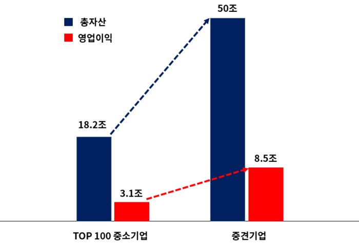 지난해 이들 기업의 평균 총자산영업이익률은 17.1%로 자산합계 18조2000억원을 활용해 3조1000억원의 이익을 창출하고 있지만, 정책지원을 통해 중견기업(자산규모 5000억원)으로 성장한다면 50조원(5000억원×100개) 규모의 자산으로 8조5000억원의 수익(50조원×17.1%)을 벌어들일 수 있다는 계산이다.