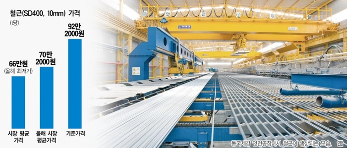 철근 기준가격과 비교하면 하락 폭은 더 두드러진다. 현재 기준가격은 t당 92만2000원으로 시장가격과 26만2000원 차이 난다. 기준가격은 대형 건설사들이 제강사와 건설현장 프로젝트 계약을 체결할 때 사용하는 지표로, 철스크랩(고철) 가격 등을 반영해 산출한다.