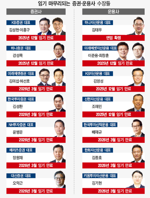 금융투자업계 관계자는 “주요 증권사와 자산운용사 실적이 전반적으로 양호해 기존 CEO의 연임 가능성이 높게 관측된다”며 “성과 중심의 인사 기조가 이어질 것”이라고 말했다.