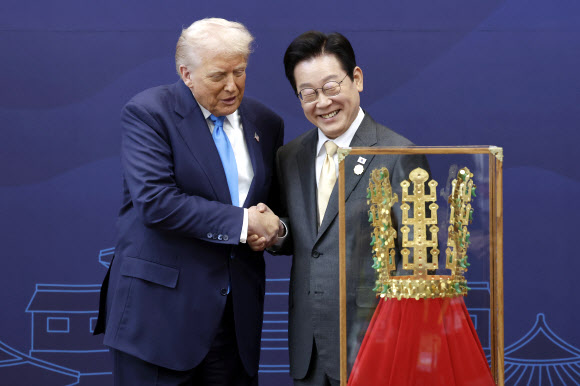 | 이재명 대통령이 지난달 29일 경북 경주박물관에서 도널드 트럼프 미국 대통령에게 ‘천마총 금관 모형’을 선물한 뒤 악수하고 있다./사진:연합뉴스 |