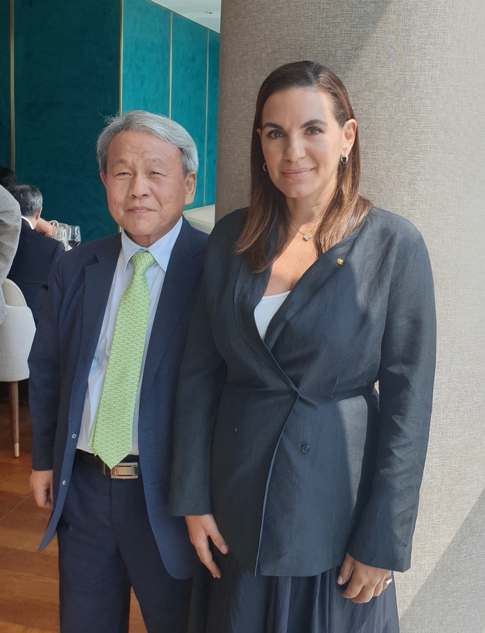 | 2025년 8월 27일 서울 나루호텔에서 열린 그리스 관광부 장관 올가 케팔로지아니(Olga Kefalogianni)환영 축하연에서 최정대 대표와 케팔로지아니 장관이 환담을 가진 뒤 기념 촬영을 했다. /사진: 최정대 대표 제공 |