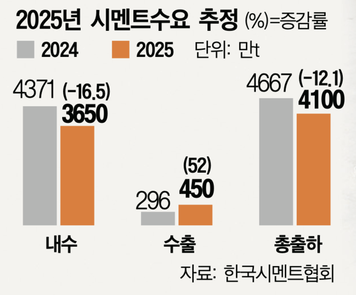 한국시멘트협회는 11일 “2025년 국내 출하(내수)가 전년 대비 16.5%(721만t) 줄어 3650만t에 그칠 것”이라고 전망했다. 1991년 내수 3711만t 이후 가장 낮은 수치다.