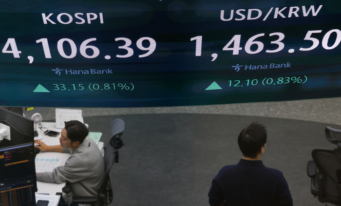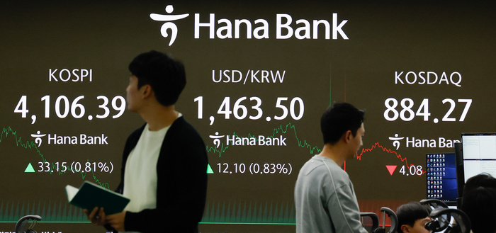 코스피가 기관과 외국인의 매수세에 전 거래일(4073.24)보다 33.15포인트(0.81%) 상승한 4106.39에 장을 마감한 11일 오후 서울 중구 하나은행 딜링룸 전광판에 지수가 표시되고 있다. 원/달러 환율 주간거래 종가는 전 거래일 대비 11.9원 오른 1463.3원을 기록했다.