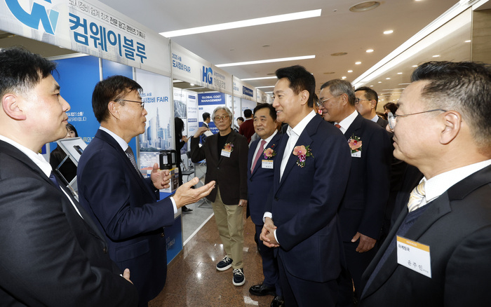 | 오세훈 서울시장이 12일 열린 ‘2025 서울 도시정비페어’에서 컴웨이블루 부스를 방문해 대화를 나누고 있다. |