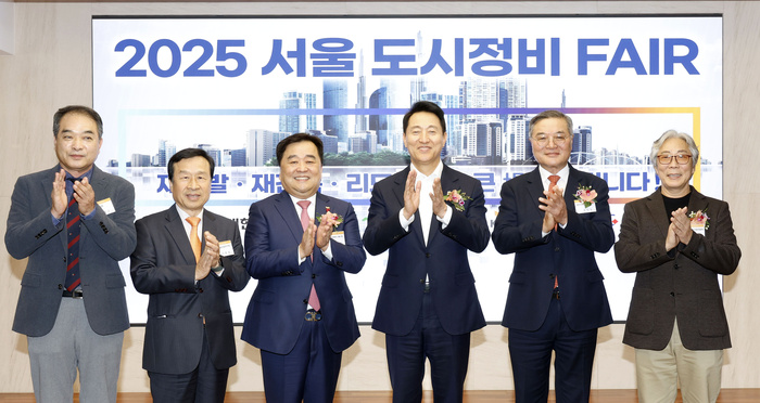 | 오세훈 서울시장(오른쪽 세번째)이 12일 열린 '2025 서울 도시정비페어'에서 행사에 앞서 관계자들과 기념촬영을 하고 있다. 오른쪽부터 김준용 서울시정비사업연합회 회장, 유일동 대한경제 사장, 오세훈 서울시장, 최태진 대한건설협회 서울시회 회장, 이충재 한국건설산업연구원 원장. 이영규 한국주택협회 전무이사. 안윤수기자 ays77@ |