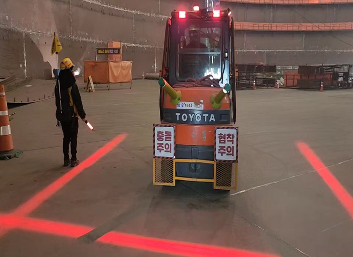 | 당진 액화천연가스(LNG) 저장탱크 1단계 현장에는건설장비 인체 접근 주의 경보 시스템이 가동되고 있다./ 가스공사 제공 |