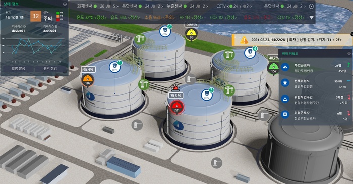 대표적인 현장이 바로 당진 LNG 저장탱크 사업장이다. 이 현장에서는 근로자 출입 단계부터 안전 관리를 시작한다. 근로자가 키오스크에 개인 QR코드를 제시하면 AI가 안전모ㆍ안전화 등 개인보호구 착용 여부를 자동으로 체크한다. 통합 관제시스템은 현장 위치별 근로자 수ㆍ밀폐공간 가스농도ㆍ외부 풍속 등 환경 데이터를 실시간으로 수집해 화재나 가스중독 같은 사고에 대응한다.