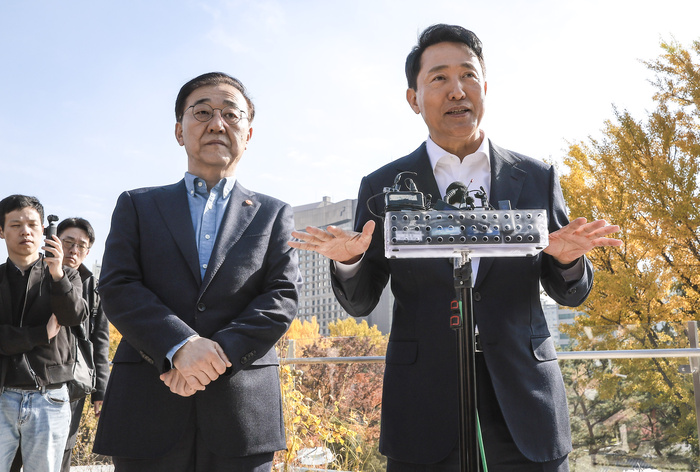 | 김윤덕 국토교통부 장관(오른쪽)과 오세훈 서울시장이 13일 서울 중구 달개비에서 오찬회동을 마친 뒤 취재진과 질의응답하고 있다./ 사진공동취재단 |