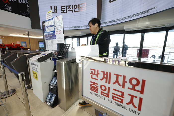 | 16일 오전 서울 잠실한강공원 선착장에서 한강버스 관계자가 출입 통제선 앞에서 안내 업무를 하고 있다. / 사진 : 안윤수 기자 |