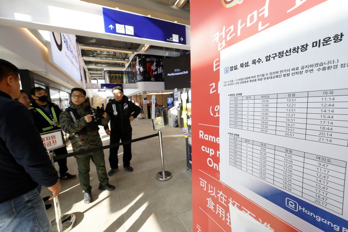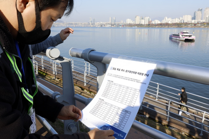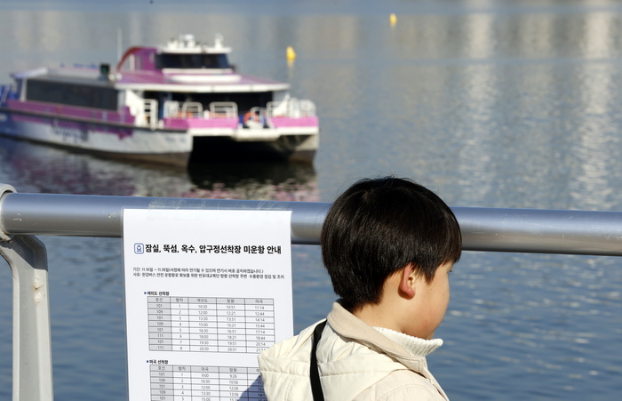 16일 서울 한강버스 잠실선착장에서 한강버스 관계자가 잠실, 뚝섬, 옥수, 압구정선착장 미운항 안내문을 붙이고 있다.
